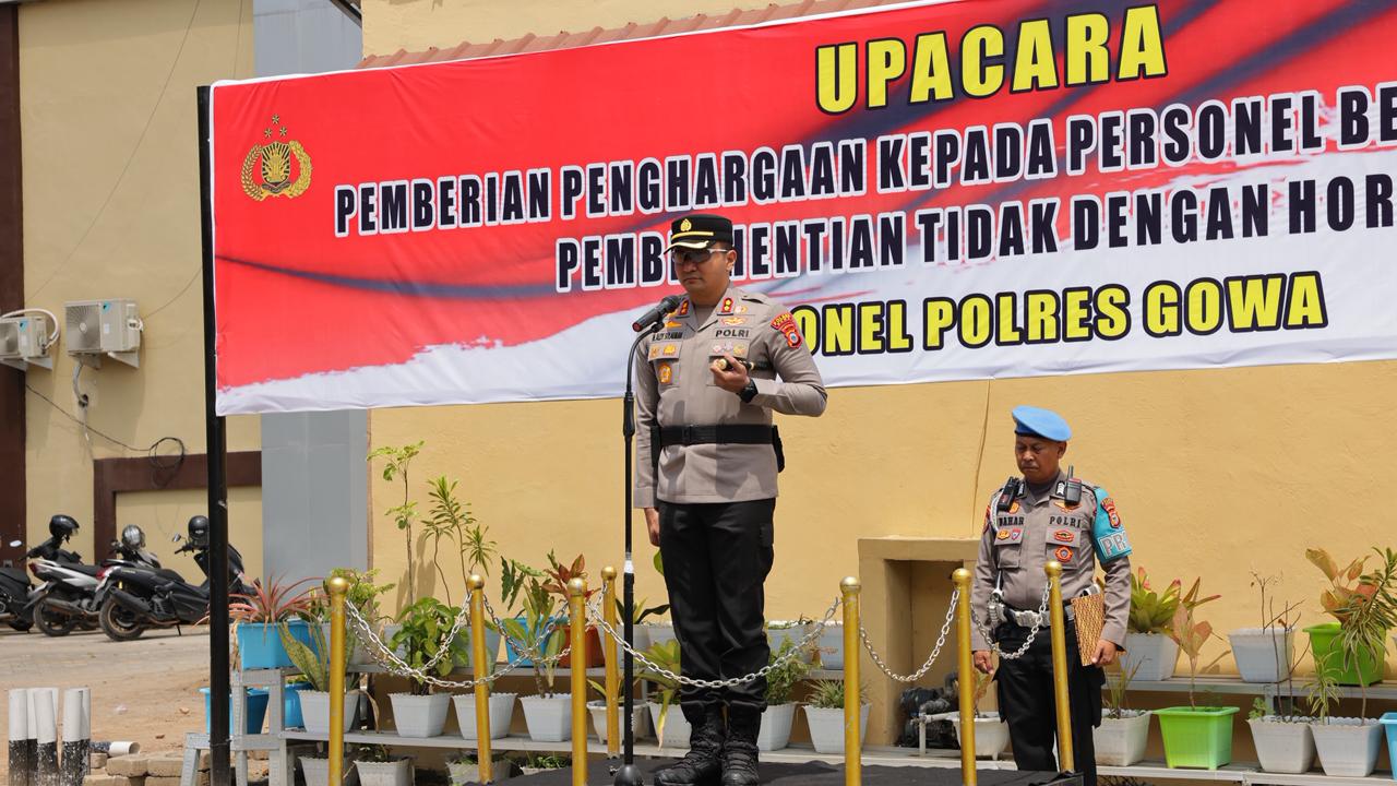 Polres Gowa melaksanakan upacara Pemberhentian Tidak Dengan Hormat (PTDH) terhadap salah satu anggotanya, AIPTU Supriadi, sekaligus memberikan penghargaan kepada 41 personel yang berprestasi, Rabu (1/10/2025).