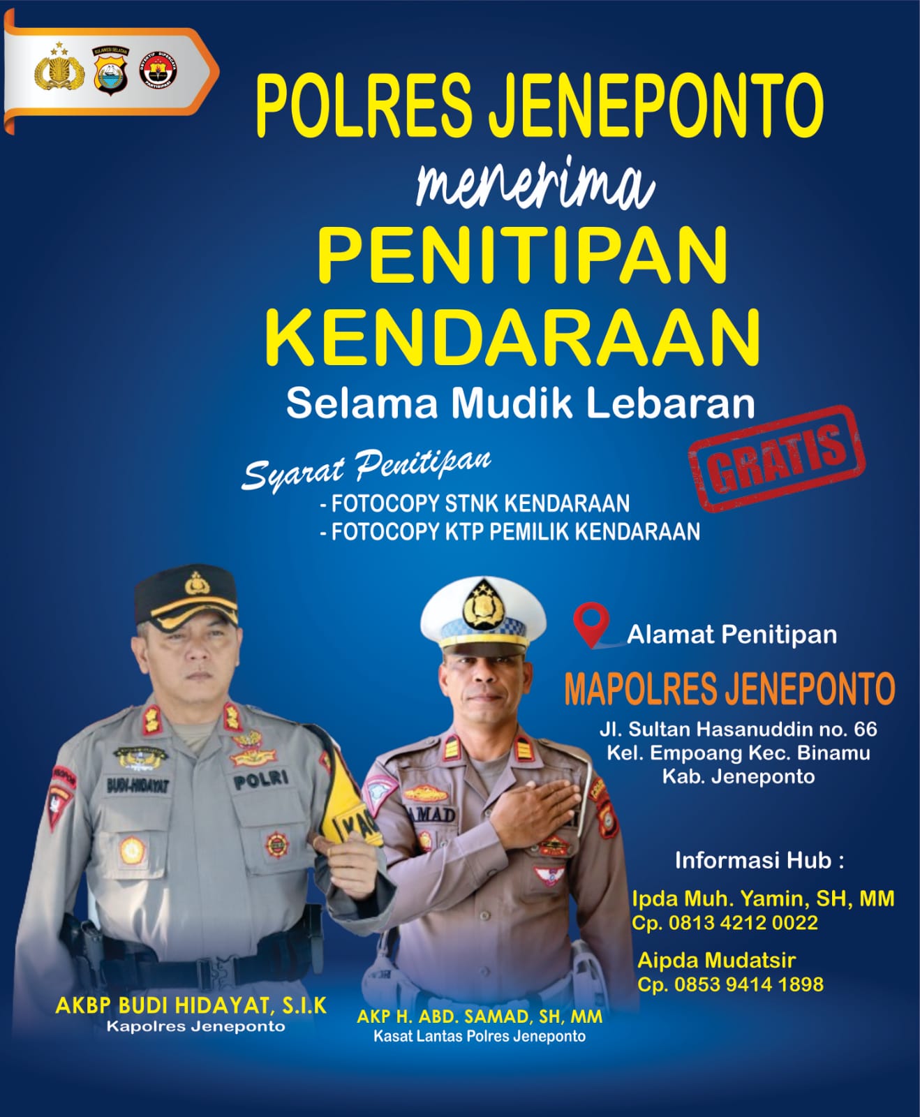 “Jadi bisa menitipkan kendaraannya atau barang berharganya di Mapolres, silahkan datang langsung atau bisa menghubungi kontak person Ipda Muh. Yamin (0813-4212-0022) dan Aipda Mudatsir (0853-9414-1898). Ini sebagai bentuk layanan kami ke masyarakat untuk mengantisipasi terjadinya tindakan kriminal atau musibah kebakaran saat mudik,” ungkapnya.