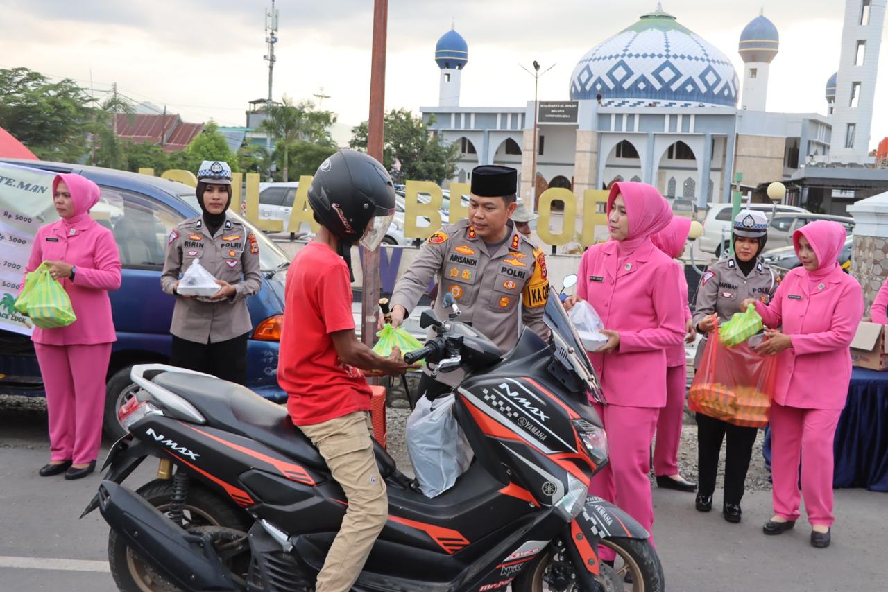 Luwu – Berkah Ramadhan Kapolres Luwu AKBP Arisandi, S.H., S.I.K., M.Si. bersama dengan Ketua Bhayangkari Cabang Luwu Ny. Rise Arisandi didampingi personil dan pengurus Bhayangkari Cabang Luwu ngabuburit dengan berbagi takjil bertempat di depan Mesjid Al-Ishlah Belopa, Jalan Trans Sulawesi, Rabu (20/3/2024).