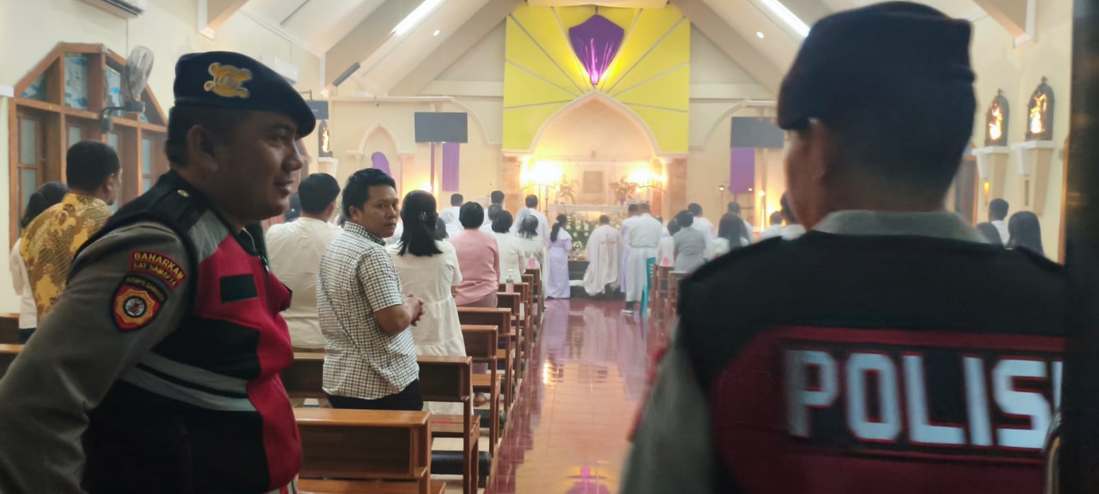 Pantauan di lapangan menunjukkan sejumlah personel kepolisian berseragam lengkap berjaga di pintu masuk dan area sekitar gereja.