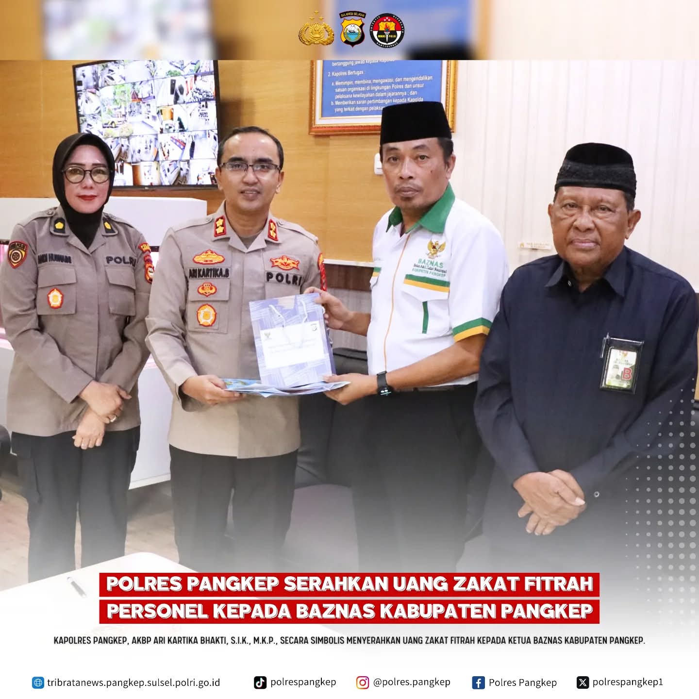 Kapolres Pangkep, AKBP Ari Kartika Bhakti, S.I.K., M.K.P., secara simbolis menyerahkan uang zakat fitrah kepada Ketua Baznas Kabupaten Pangkep.