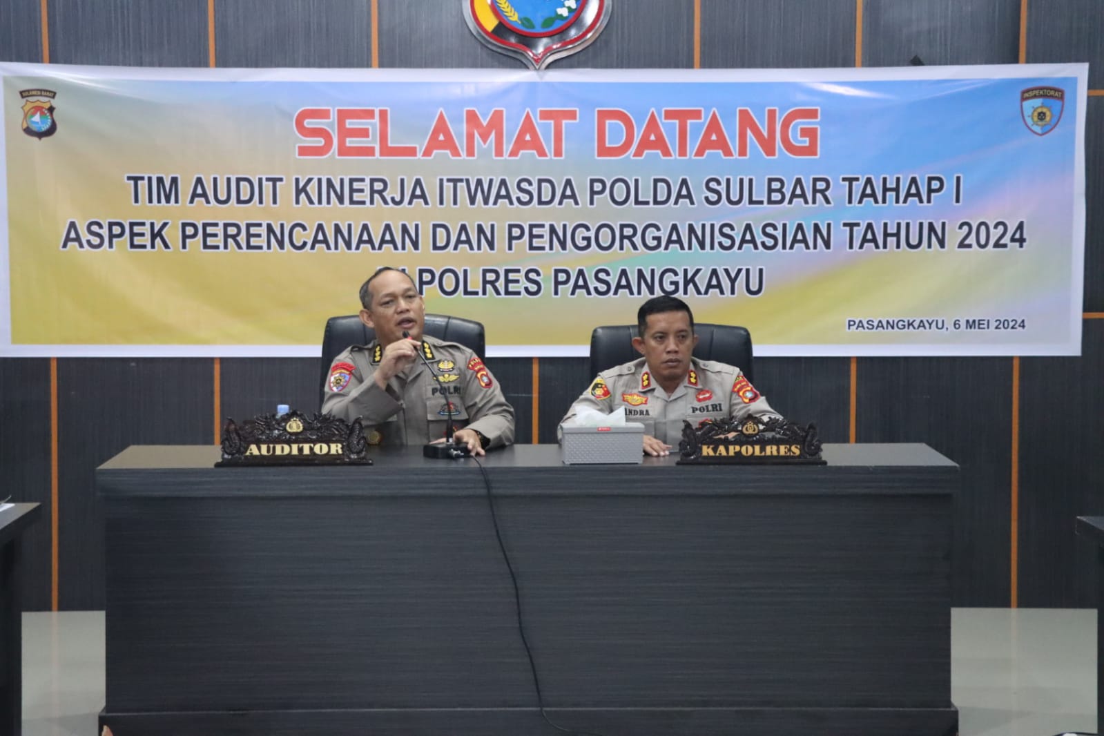 Di Polres Pasangkayu tim Audit Kinerja dari Inspektorat Pengawasan Daerah (Itwasda) Polda Sulbar Tahap I T.A 2024 disambut langsung oleh Kapolres Pasangkayu, Jumat (3/5/24) di Aula Rupatama Polres Pasangkayu.