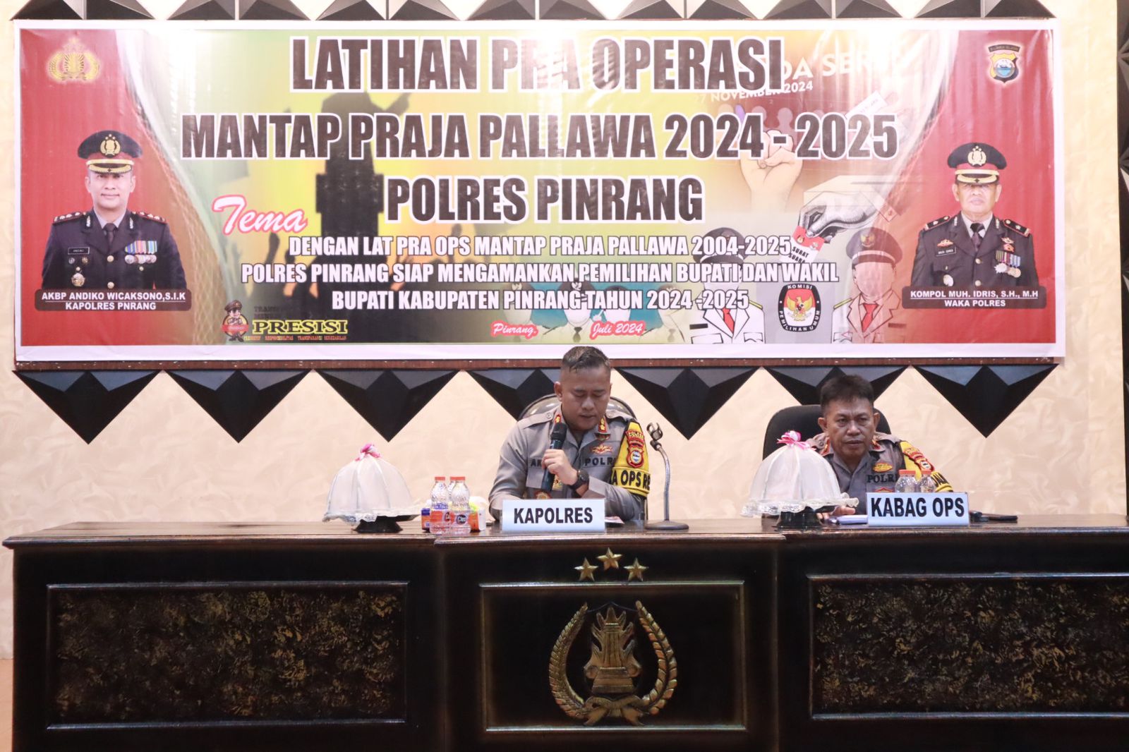 Usai arahan Kapolres Pinrang, Latihan Pra Operasi Mantap Praja di lanjutkan dengan paparan dinamika operasi dari Kabag Ops Polres Pinrang Kompol Muh.Yusuf Badu, SH, kemudian dilanjutkan paparan oleh Kasat Intelkam selaku Kasatgasres Preemtif, Kasat Binmas selaku Kasubsatgas Binmas Satgasres 1 Preemtif , Kasat Samapta selaku Kasatgasres 2 Preventif, Kasat lantas Selaku Kasatgasres 3 Kamseltibcarlantas, Kasat Reskrim selaku Kasatgasres 4 Gakkum, Kasi Humas Selaku Kasatgasres 5 Humas, Kabag Log Selaku Kasatgasres 6 Ban ops, Kasi Propam Selaku Kasubsatgas Propam Satgasres 6 Ban Ops.