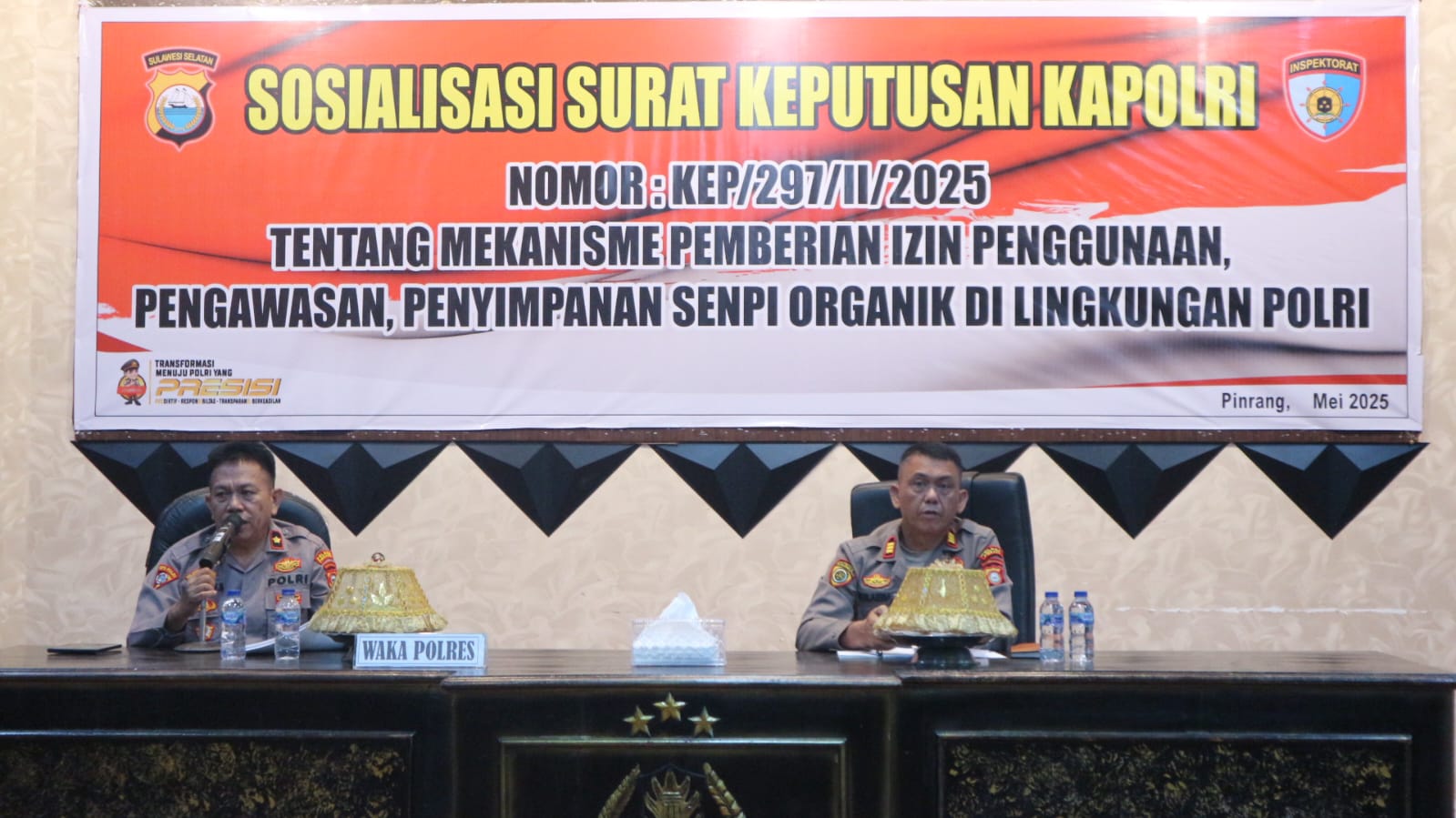 Kegiatan Sosiaslisasi dibuka langsung oleh Wakapolres KOMPOL Muhammad Yusuf Badu, S.H yang dihadiri oleh para pejabat utama Polres Pinrang, Kapolsek jajaran, serta personel Polres. Dalam kegiatan tersebut, sejumlah pemateri memberikan paparan terkait regulasi dan pengawasan penggunaan senjata api oleh anggota Polri.