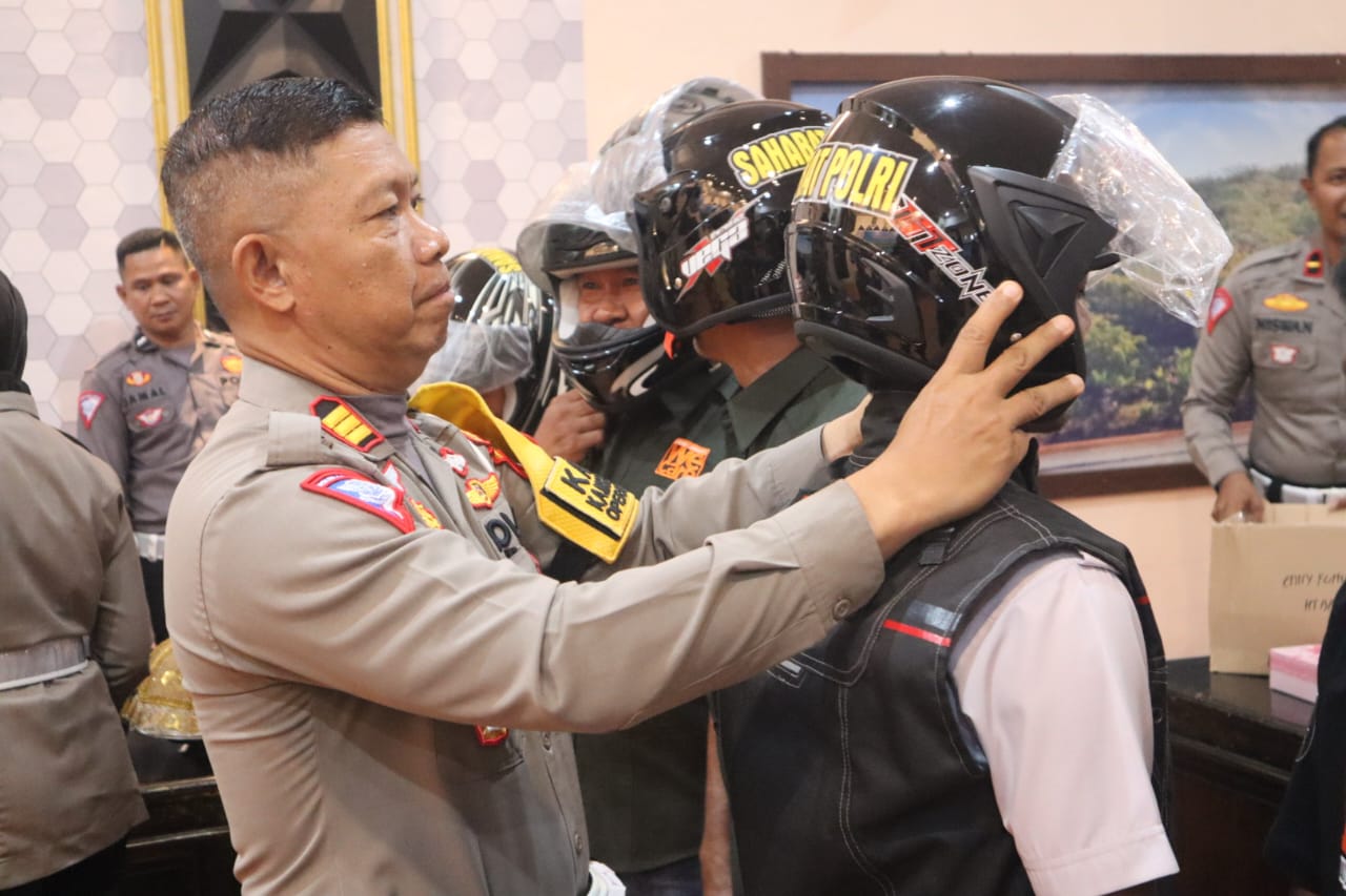 selanjutnya dilakukan pembacaan deklarasi oleh kasat lantas dan diikuti oleh peserta yang hadir dan penyerahan helm SNI.