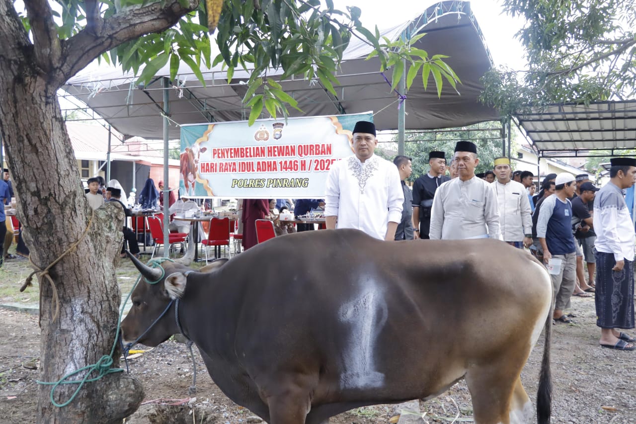 PINRANG — Dalam rangka memperingati Hari Raya Idul Adha 1446 Hijriah, keluarga besar Polres Pinrang melaksanakan penyembelihan hewan qurban sebanyak 17 ekor sapi, Jumat (6/6/2025). Prosesi penyembelihan berlangsung di halaman Asrama Polisi Polres Pinrang, Jalan Basuki Rahmat, Kelurahan Maccorawalie, Kecamatan Watang Sawitto Kabupaten Pinrang.