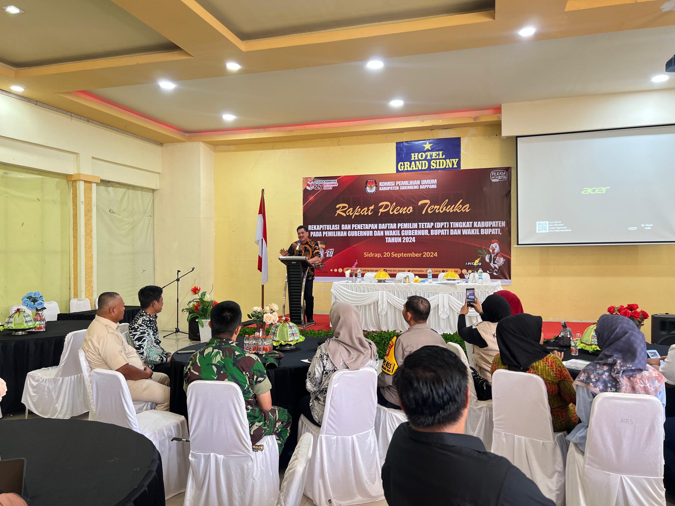 SIDRAP – Polres Sidrap mengerahkan sejumlah personel untuk mengamankan jalannya rapat pleno terbuka penetapan Daftar Pemilih Tetap (DPT) yang berlangsung di Ballroom Hotel Grand Sidny, Jumat (20/09/24). Kegiatan ini merupakan bagian dari rangkaian proses Pemilihan Kepala Daerah (Pilkada) 2024 di Kabupaten Sidrap.