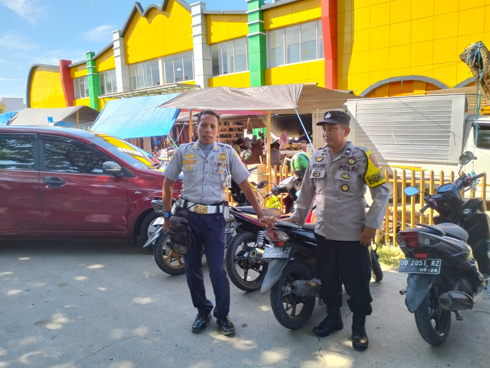 Bhabinkamtibmas Polres Soppeng, AIPDA Ibrahim, melakukan patroli dialogis di Pasar Sentral Lapajung, Kec. Lalabata, Kab. Soppeng. Kamis, 17 April 2025.