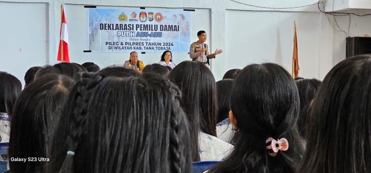 “Hari ini sesuai arahan pimpinana Bpk. Kapolda Sulsel Kami dari jajaran Polres Tana Toraja serentak menggelar deklarasi pemilu damai putih abu – abu dalam rangka pemilihan legislatif, pemilihan Presiden dan wakil Presiden tahun 2024, tujuannya adalah mengajak para pelajar selaku pemilih pemula untuk menyukseskan pemilu damai 2024 yang berintegritas dan turut menjaga kamtibmas khususnya di wilayah Kabupaten Tana Toraja” Ungkap Kapolres Tana Toraja
