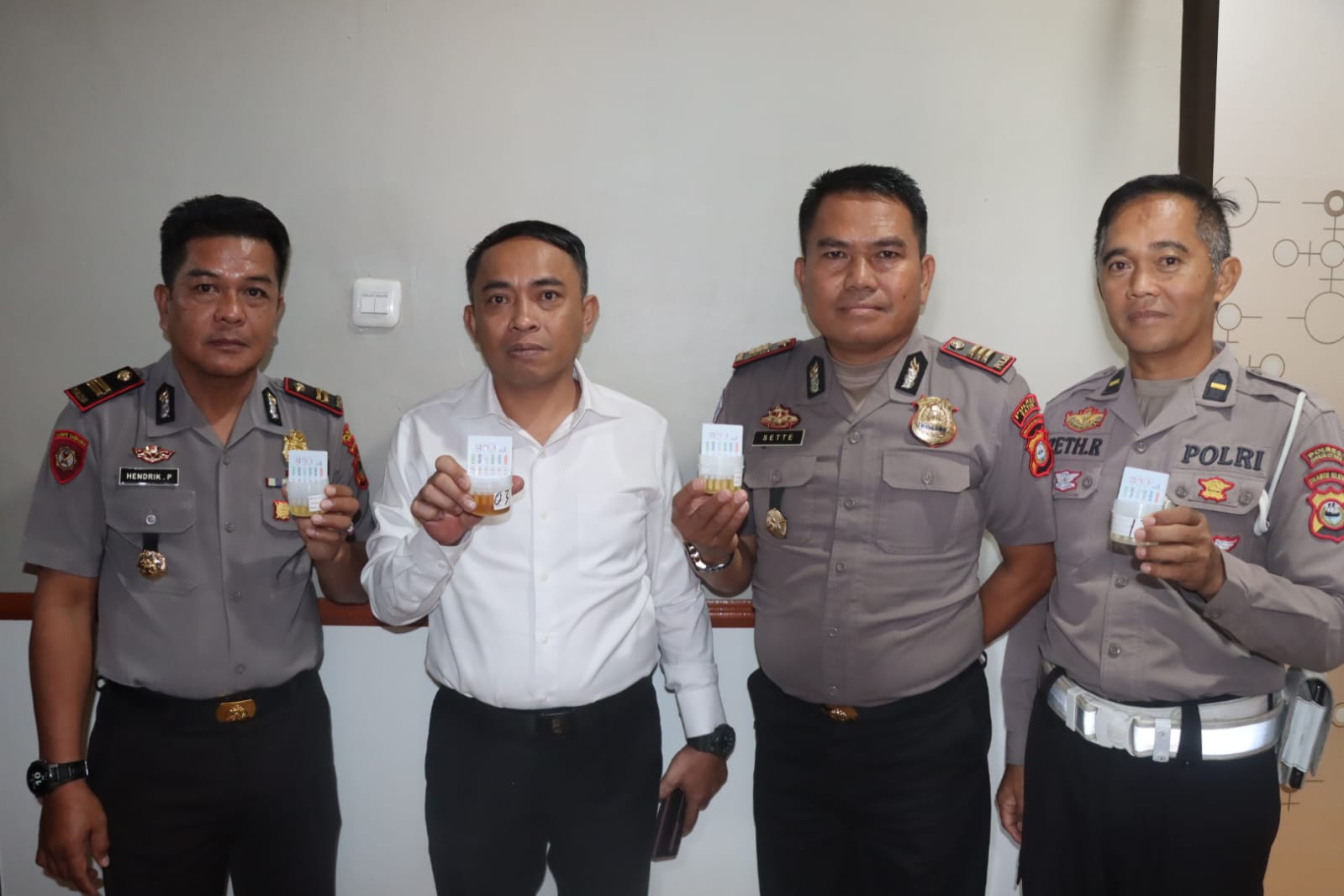 “Hari ini Kita lakukan pemeriksaan urine kepada sejumlah personel secara dadakan. Ada total 65 personel yang menjalani tes urine, dan Puji Tuhan secara keseluruhan hasilnya negatif sebagai pengguna narkoba,” terang Kapolres