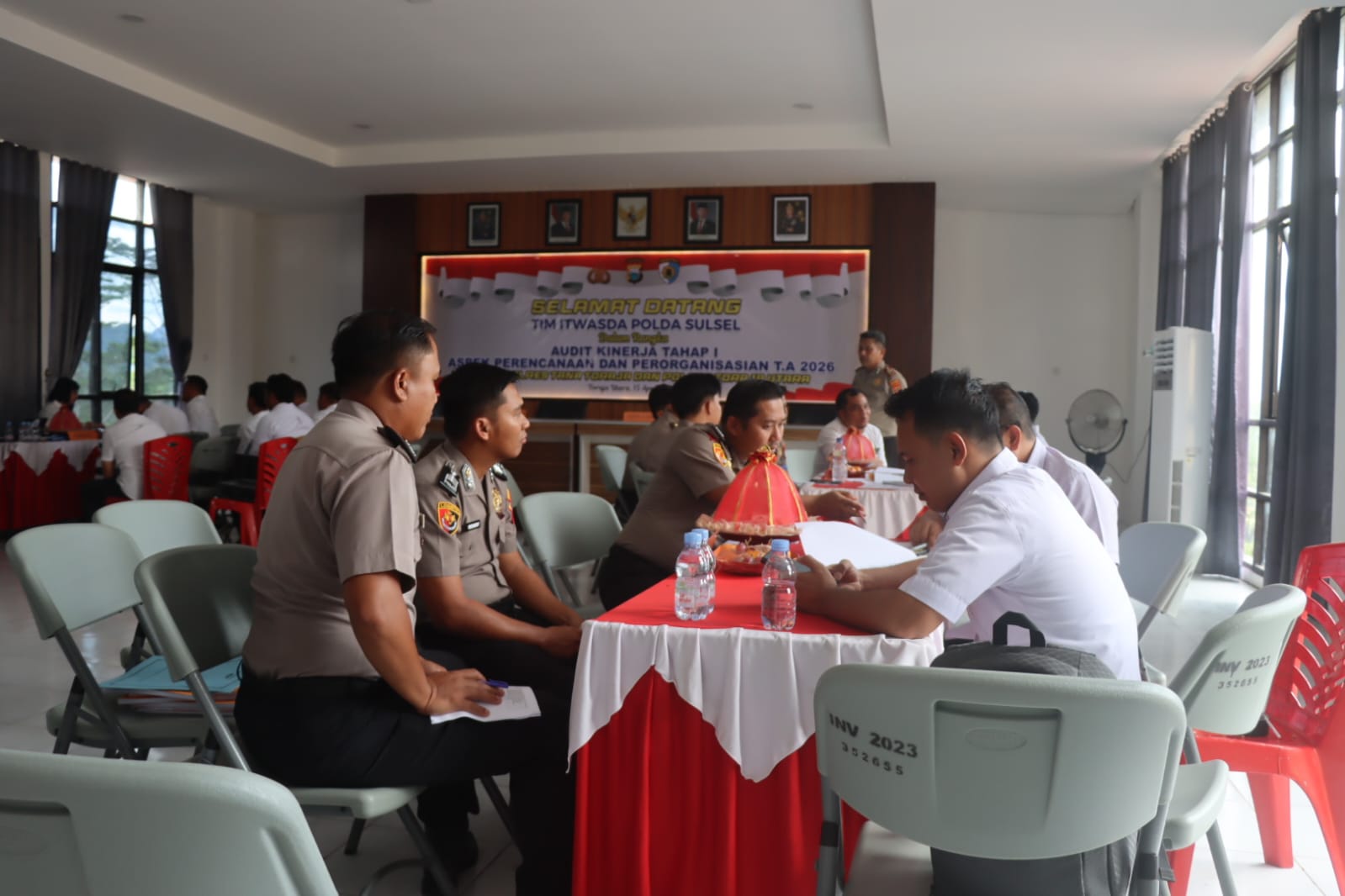 Polres Toraja Utara menerima kunjungan Tim Itwasda Polda Sulsel dalam rangka pelaksanaan Audit Kinerja Tahap I Tahun 2026 aspek perencanaan dan pengorganisasian yang digelar di Aula Mapolres Toraja Utara, Rabu (15/04/2026) pagi.