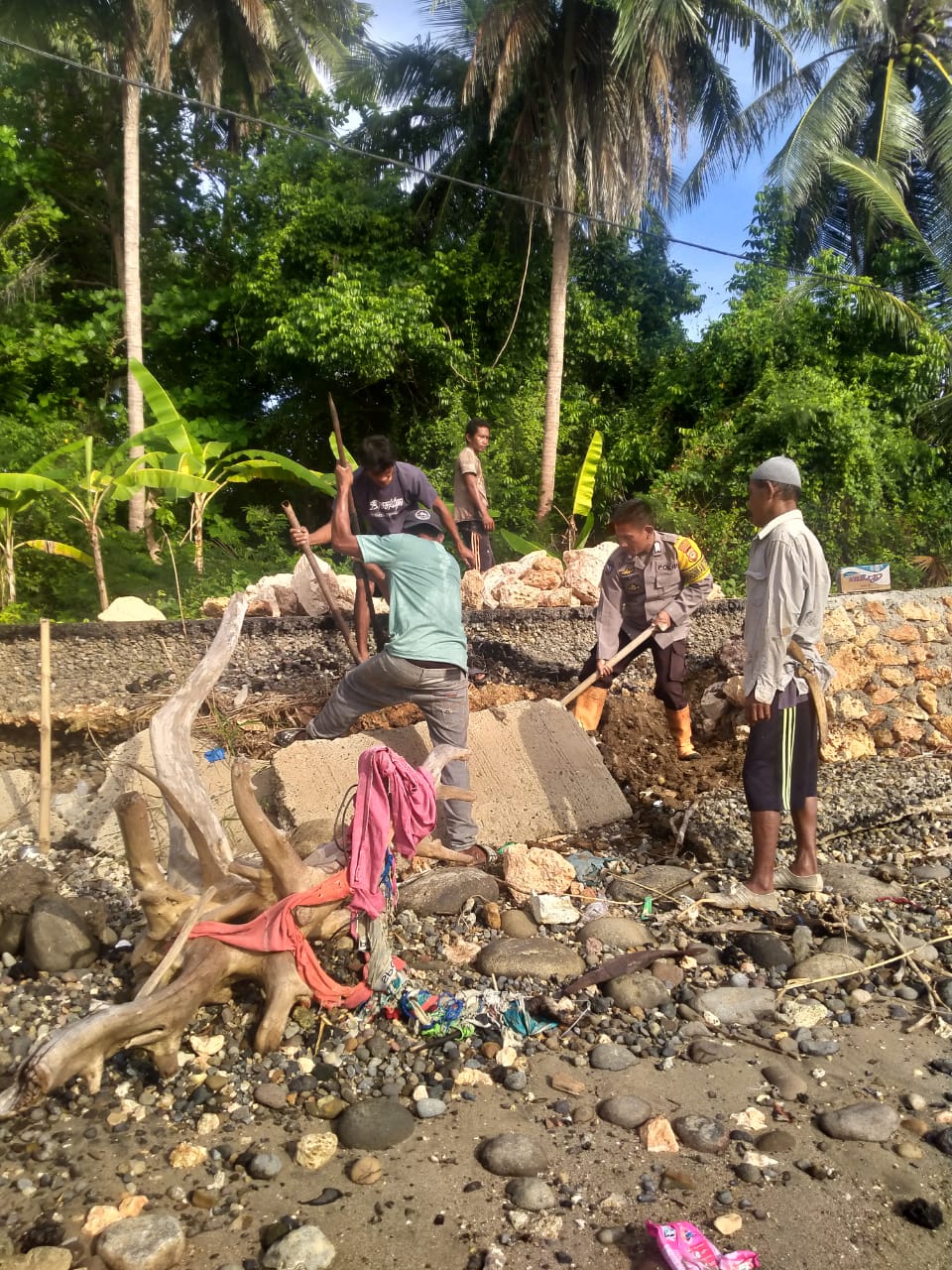 Dengan semangat gotong royong, warga dan aparat bahu-membahu memperbaiki infrastruktur tersebut demi kelancaran dan keselamatan bersama.