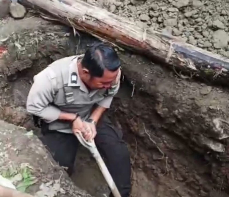 “Setelah melayat ke rumah duka, saya langsung ke lokasi kuburan untuk membantu keluarga dan warga menggali liang lahat sebagai bentuk kepedulian dan empati kemanusiaan,” ungkap Aiptu Jusman.