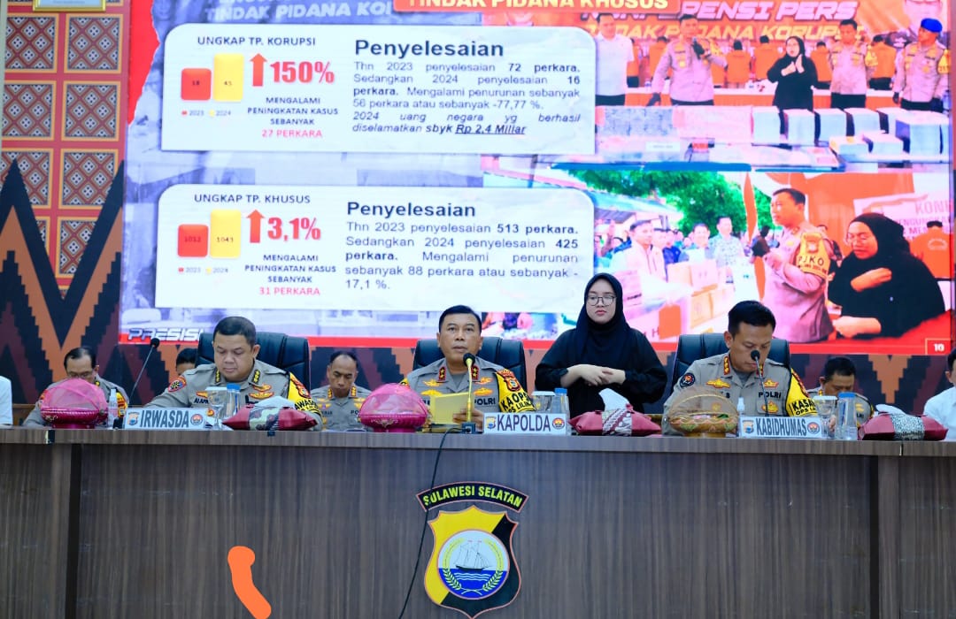 Acara ini bertujuan untuk menyampaikan laporan kinerja Polda Sulsel sepanjang tahun 2024 mulai dari capaian pengungkapan kasus kriminal hingga prestasi, Senin (30/12/2024)