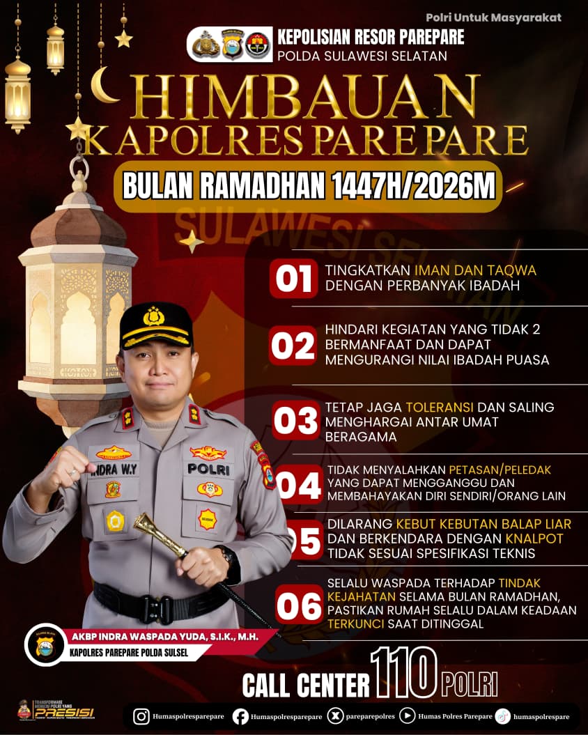 PAREPARE — Kepolisian Resor Parepare merilis imbauan kamtibmas dari Kapolres Parepare AKBP. Indra Waspada Yuda kepada masyarakat dalam rangka menjaga suasana aman, nyaman, dan penuh khidmat selama bulan suci Ramadan 1447 Hijriah. Sabtu (7/3/2026).