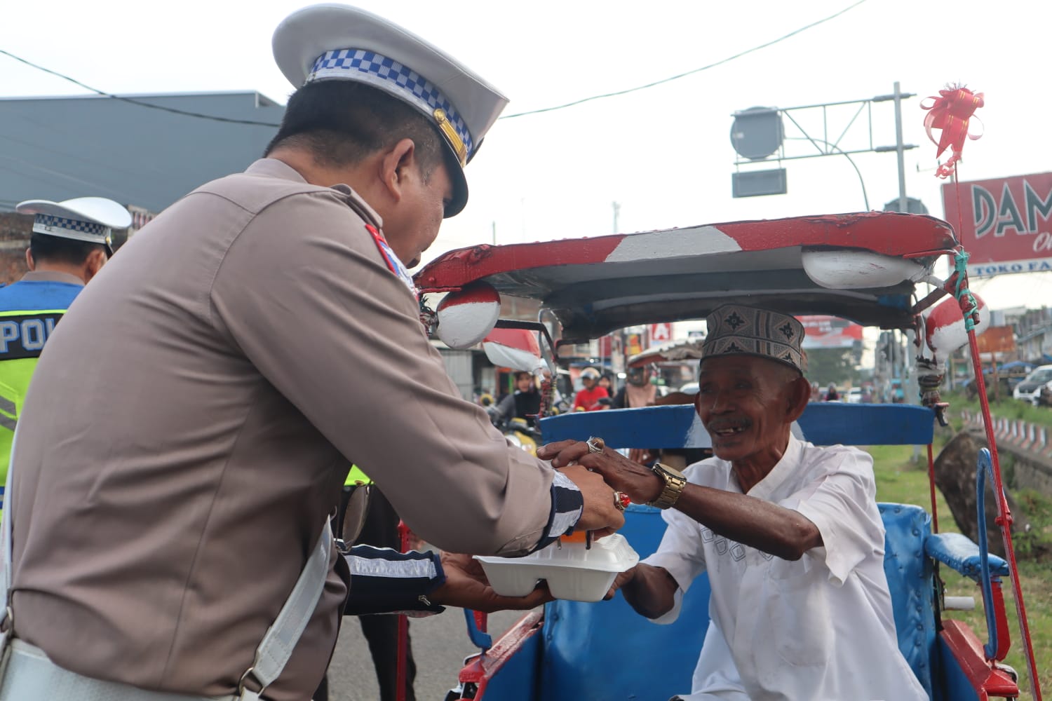Selain membagikan takjil, personel Sat Lantas juga memanfaatkan kesempatan ini untuk menyampaikan imbauan keselamatan berkendara dan pentingnya menjaga ketertiban lalu lintas selama Ramadhan.