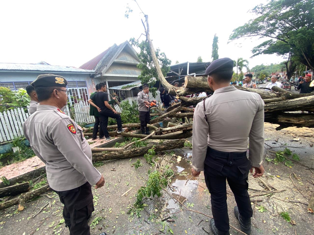 Dengan menggunakan mesin pemotong, personel Polres Majene bersama warga setempat bergotong royong membersihkan pohon tumbang. Batang dan ranting pohon dipotong serta disingkirkan ke tepi jalan guna membuka kembali akses kendaraan yang sempat terhambat.