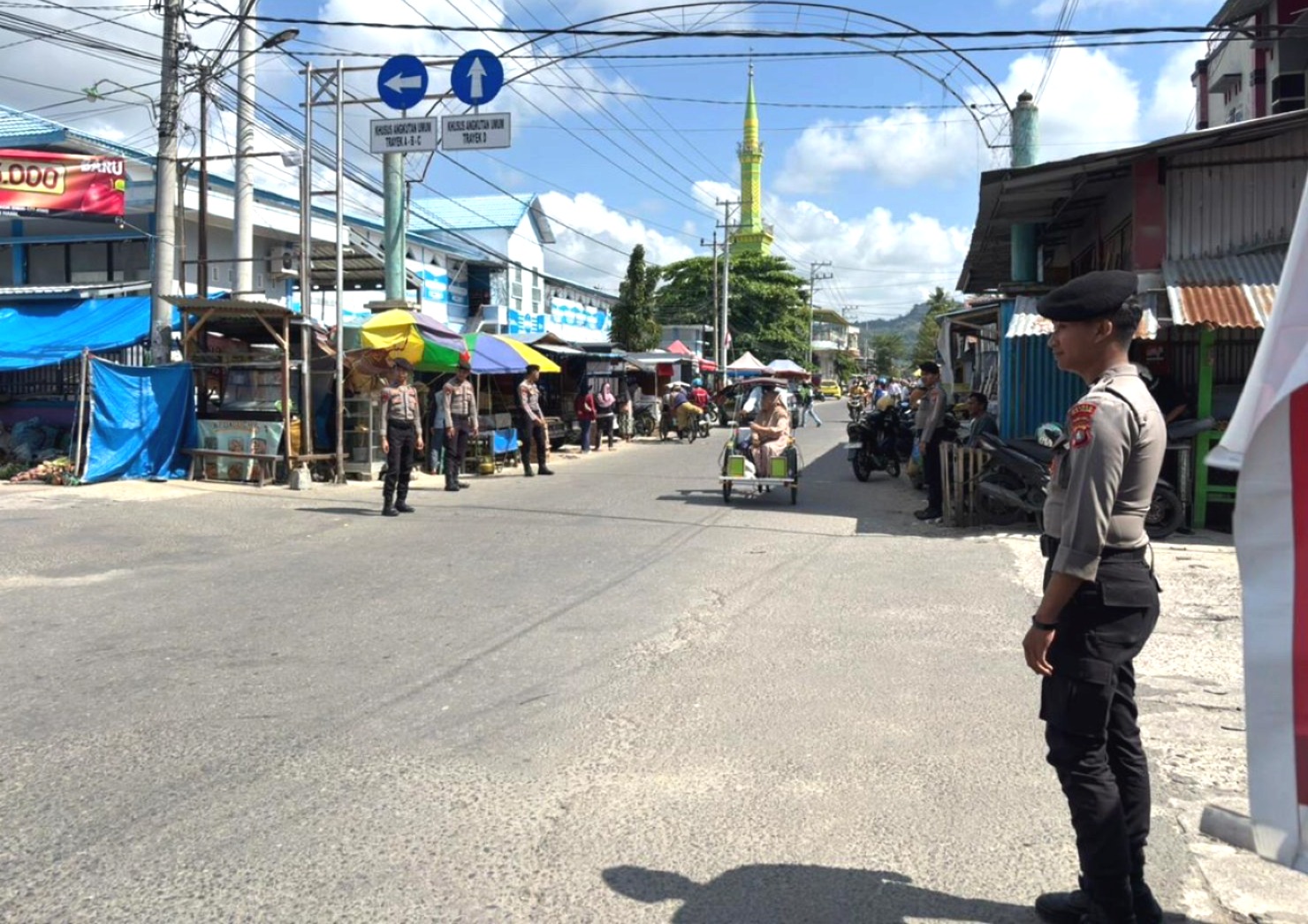 Dalam pelaksanaannya, personel melakukan pemantauan situasi, berdialog dengan masyarakat, serta memberikan imbauan kepada para pedagang, pengunjung pasar, dan pengguna jalan untuk bersama-sama menjaga keamanan lingkungan sekitar.