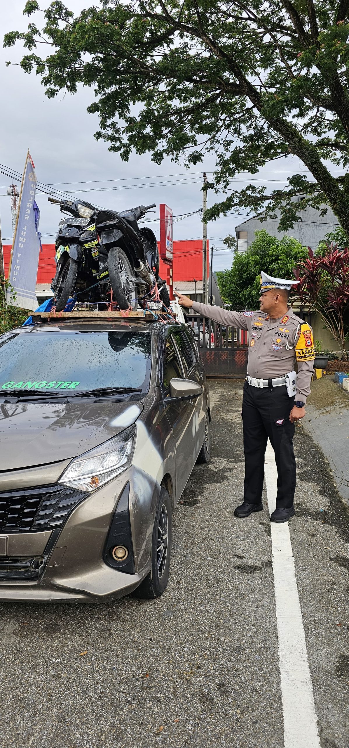 “Setelah diperiksa sopir tidak memiliki SIM, dan memuat 2 Motor diatas kap mobil dan penumpang 5 orang, ke 2 ban bekas pres gundu, ini sangat membahayakan bagi sopir dan penumpang nya dan pengguna jalan, terhadap sopir sudah dilakukan tindakan tilang” Ujar Kasat