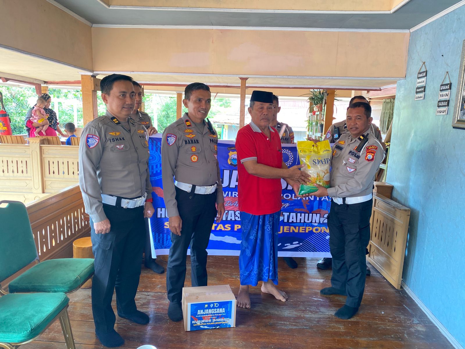 JENEPONTO- Polantas Bhayangkara ke-70 tahun 2025, Personil Satlantas Polres Jeneponto, yang dipimpin oleh Kasat Lantas, didampingi oleh KBO Lantas serta Kanit Regident, melaksanakan kegiatan silaturahmi dan pemberian bantuan sosial (Bansos) kepada purnawirawan Polri Polantas Bhayangkara.