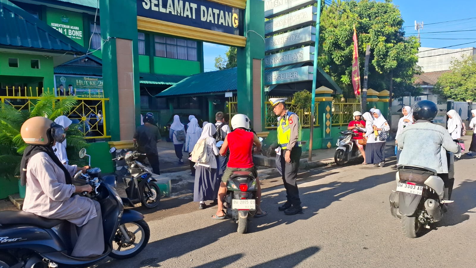 Personel Unit Kamsel melaksanakan kegiatan imbauan keselamatan berlalu lintas kepada orang tua siswa yang mengantar anaknya ke sekolah serta kepada para guru di MTs Negeri 1 Bone.