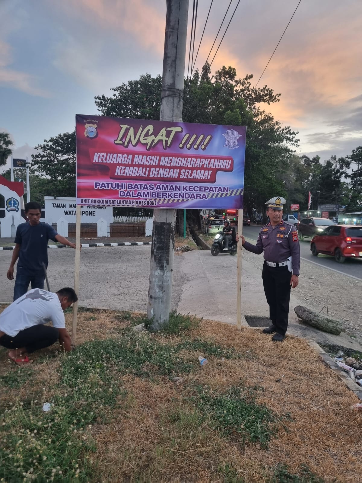 Petugas memasang spanduk berisi peringatan dan imbauan keselamatan berkendara di Jalan Poros Bone – Sinjai Km 5-7. Spanduk tersebut dipasang di sejumlah titik strategis di pinggir jalan.
