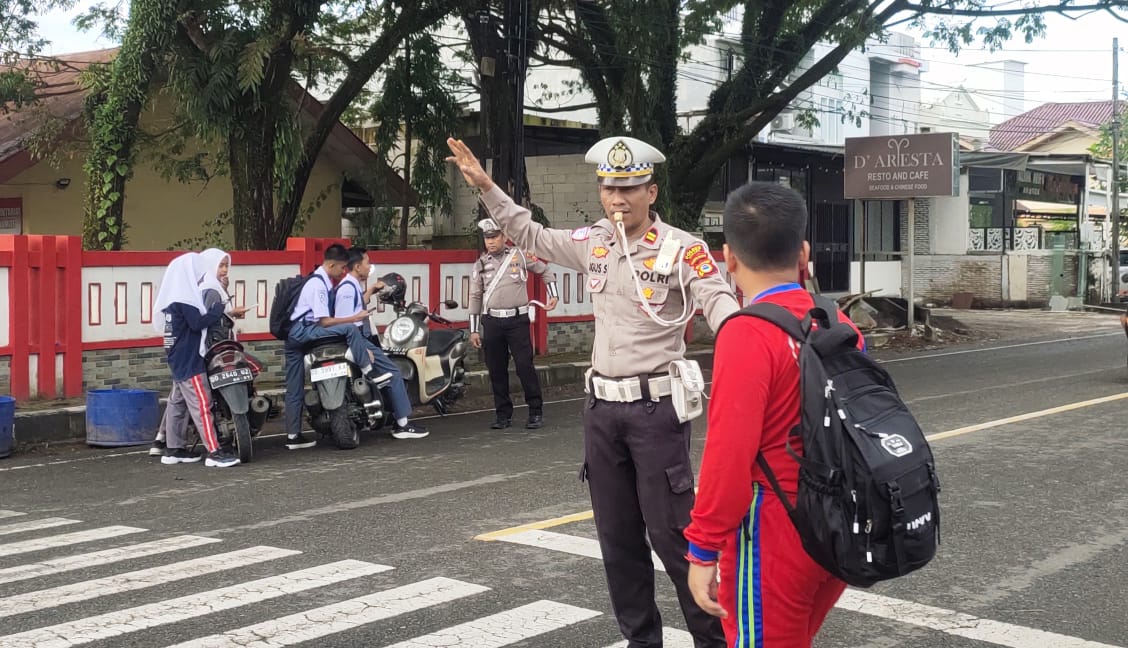Tidak hanya mengatur kendaraan, personel Satlantas juga aktif membantu menyeberangkan pelajar dan pejalan kaki, serta mengingatkan pengendara untuk menggunakan helm dan mematuhi rambu lalu lintas.