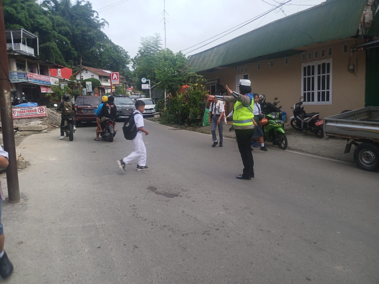 Personel Satlantas tampak sigap mengatur arus kendaraan, membantu kelancaran lalu lintas, serta memberikan pendampingan kepada anak-anak sekolah dan masyarakat saat melintas di jalan. Kehadiran anggota Polri di lapangan mencerminkan pelayanan humanis yang dirasakan langsung oleh warga.