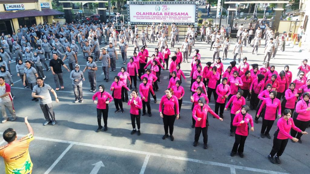 Makassar-Dalam rangka memperingati Hari Kesatuan Gerak Bhayangkari (HKGB) ke-73 Tahun 2025, Kepolisian Resor Kota Besar (Polrestabes) Makassar menggelar kegiatan olahraga bersama di lapangan apel Polrestabes Makassar, Jumat (03/10/2025).