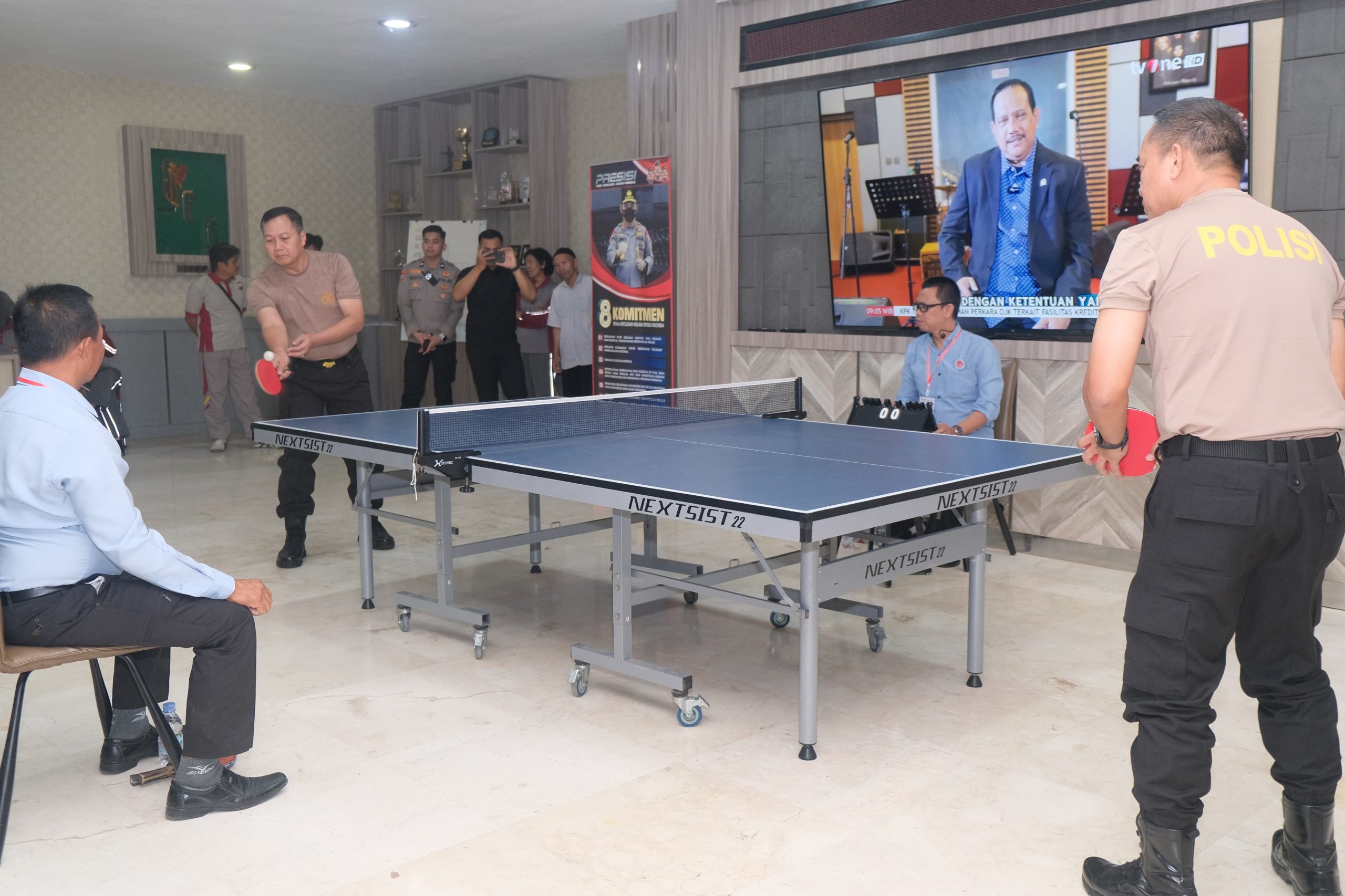 Dalam rangka memeriahkan Hari Ulang Tahun Bhayangkara ke-79, Polda Sulawesi Selatan menggelar Pertandingan Tenis Meja Antar Satuan Kerja (Satker) dan Pejabat Utama (PJU) di Lobby Lontang Adduppangeng, Lantai 1 Mapolda Sulsel, Selasa (24/06/2025).
