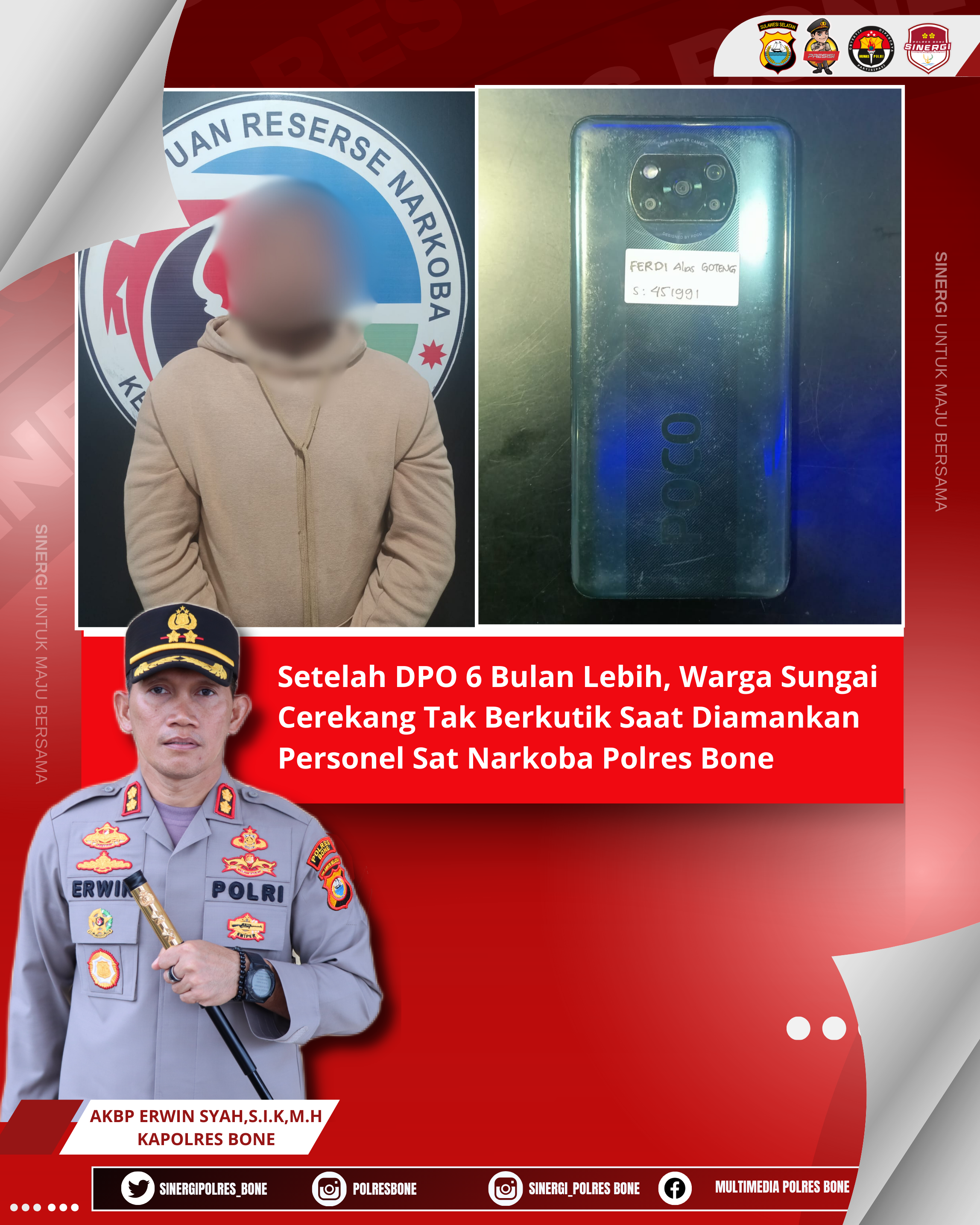 Kapolres Bone AKBP Erwin Syah, S.I.K.M.H melalui Kasat Narkoba Polres Bone IPTU Aswar, SH menyampaikan bahwa, Pelaku FOT Alias G Bin T alamat Jalan Sungai Cerekang, Kelurahan TA diamankan di pinggir jalan Yos Sudarso, Kelurahan Cellu, Kecamatan Tanete Riattang Timur pada Selasa 3 September 2024.
