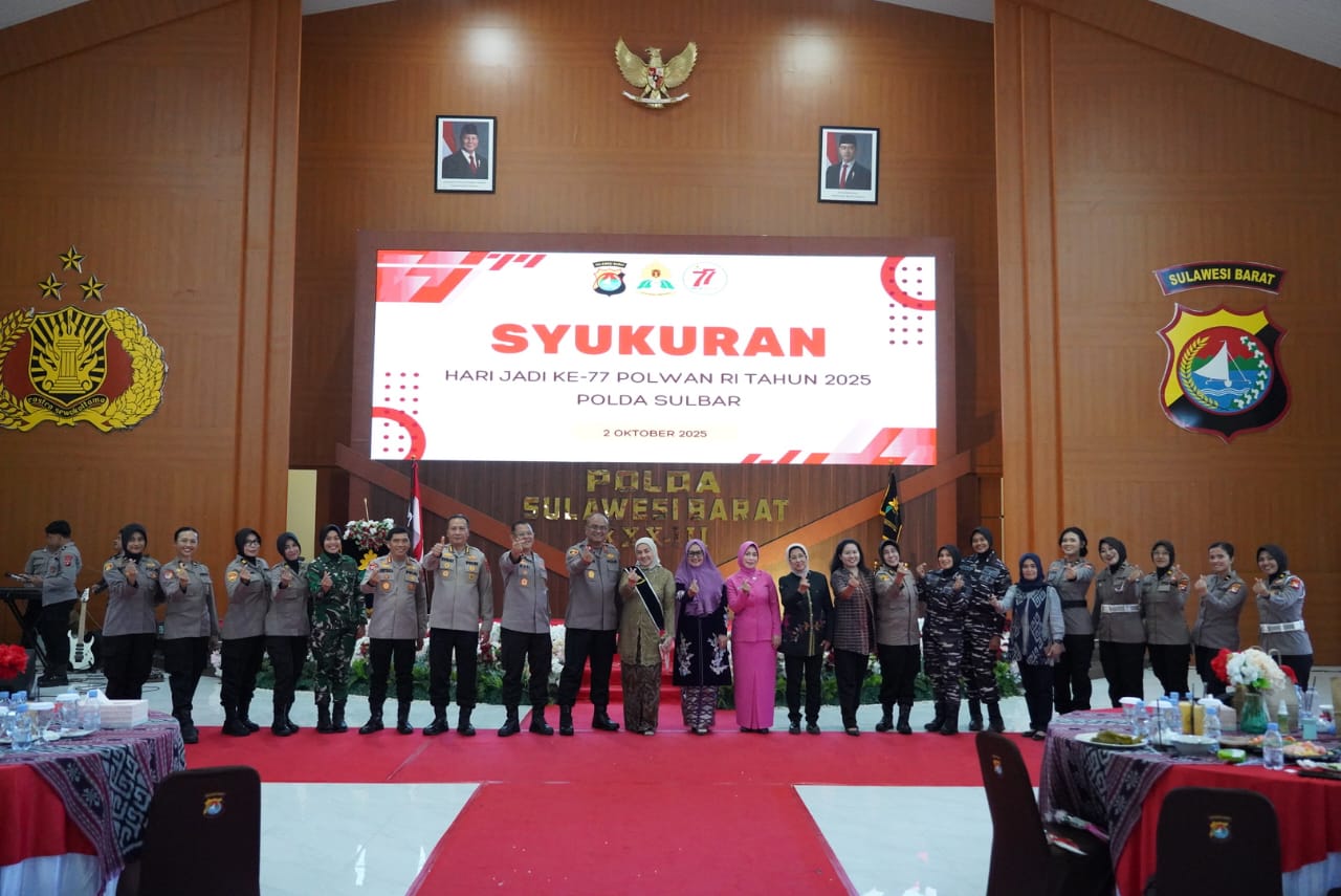 Polda Sulbar – Polda Sulawesi Barat menggelar syukuran Hari Ulang Tahun ke-77 Polisi Wanita (Polwan) Republik Indonesia dengan meriah di Aula Marannu, Kamis (2/10/25).