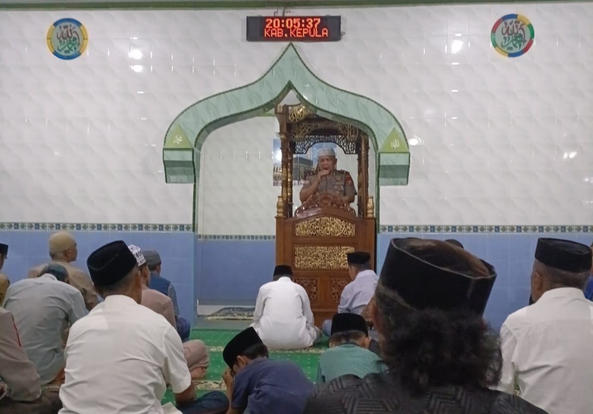 KEP. SELAYAR-Kasat Binmas Polres Kepulauan Selayar IPTU Jajang Solehuddin membawakan ceramah dan pesan kamtibmas dalam kegiatan Tarawih Keliling di Masjid Baburrahim, Jalan Veteran, Kelurahan Benteng Utara, Kecamatan Benteng, Kabupaten Kepulauan Selayar, Minggu malam (01/03/2026).