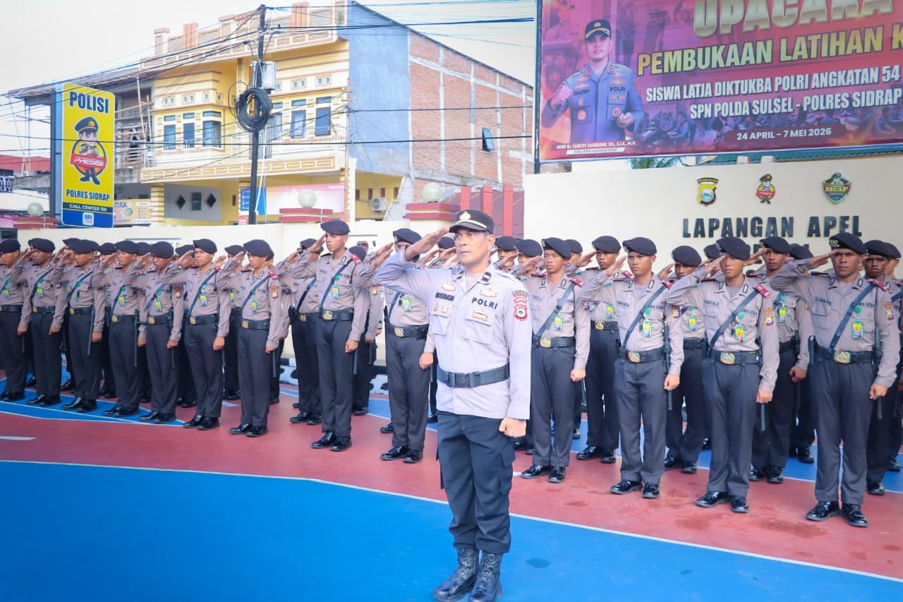 Sidrap, Kepolisian Resort Sidrap menggelar upacara pembukaan Latihan Kerja (Latja) Siswa Pendidikan Pembentukan Bintara (Diktukba) Polri Angkatan 54 Tahun Anggaran 2026 di Lapangan Presisi Polres Sidrap, Selasa (28/4/26) pagi.