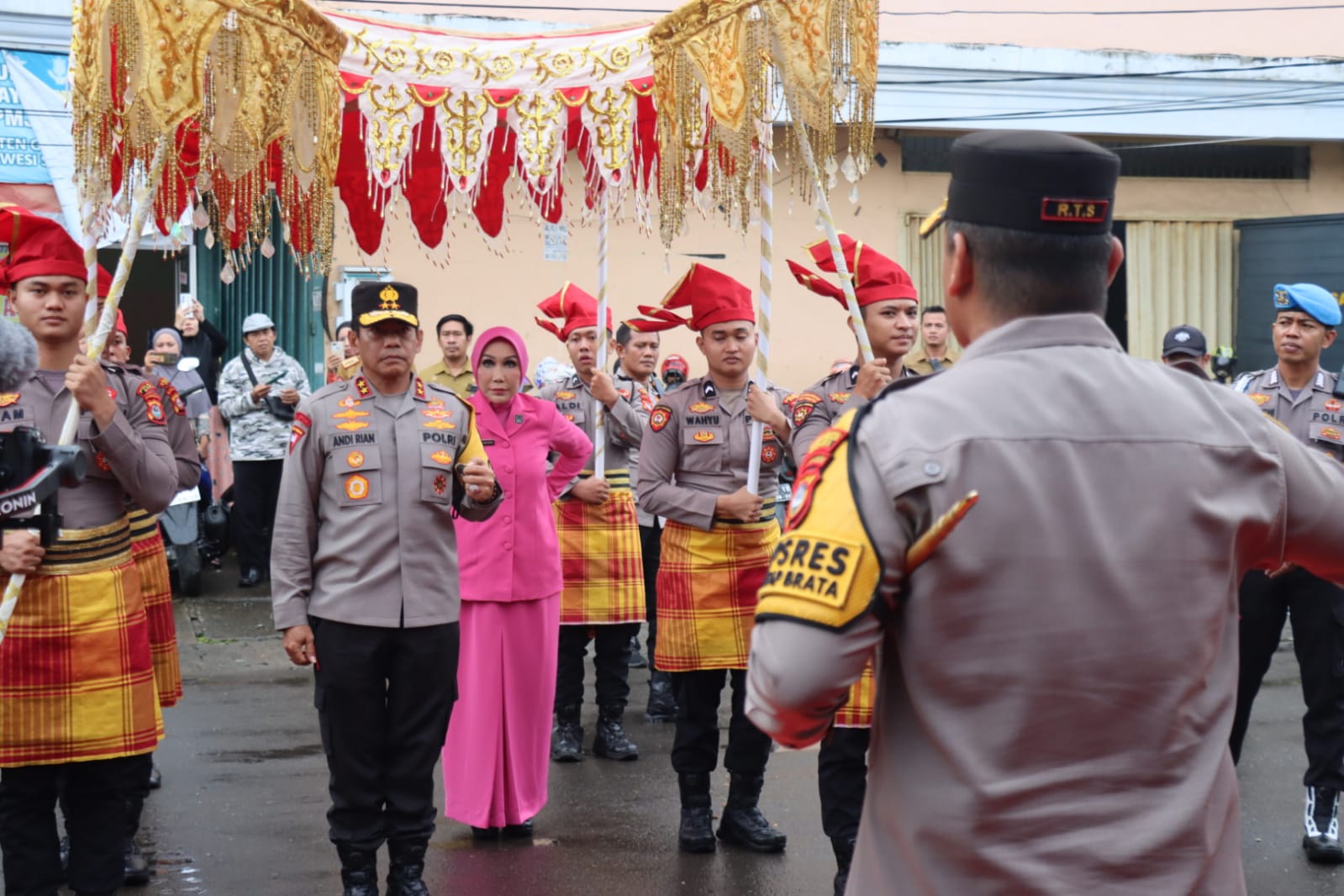 Kapolda Sulawesi Selatan Irjen Pol Andi Rian R.Djajadi, S.I.K., M.H didampingi Ketua Bhayangkari Daerah Sulsel Ny. Dewwy Andi Rian pertama kali menginjakkan kaki di Markas Komando Polres Gowa, Selasa (23/1/2024).