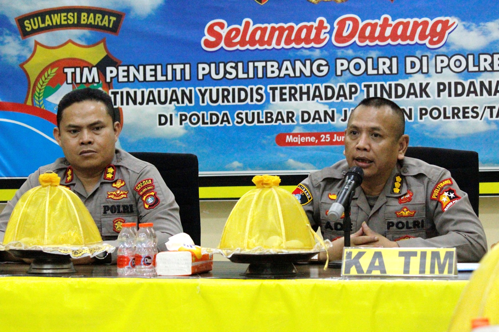 Kedatangan Tim Puslitbang Polri diterima langsung oleh Kapolres Majene, AKBP Toni Sugadri, bersama Kasat Reskrim, Kasi Humas, dan para Kapolsek jajaran. Dalam sambutannya, Kapolres Majene mengucapkan selamat datang kepada Tim Puslitbang Polri dan menyampaikan apresiasi atas kunjungan tersebut.