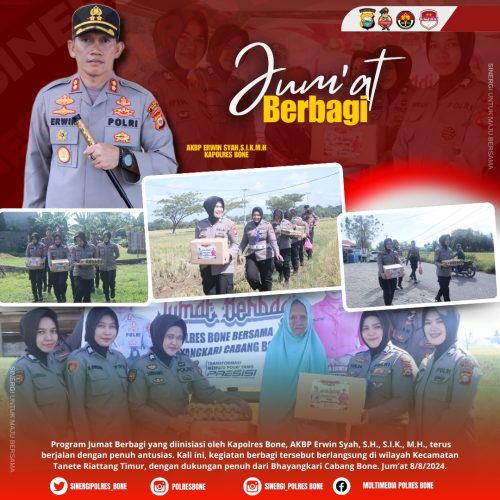 Bone,– Program Jumat Berbagi yang diinisiasi oleh Kapolres Bone, AKBP Erwin Syah, S.H., S.I.K., M.H., terus berjalan dengan penuh antusias. Kali ini, kegiatan berbagi tersebut berlangsung di wilayah Kecamatan Tanete Riattang Timur, dengan dukungan penuh dari Bhayangkari Cabang Bone. Jum’at 8/8/2024.