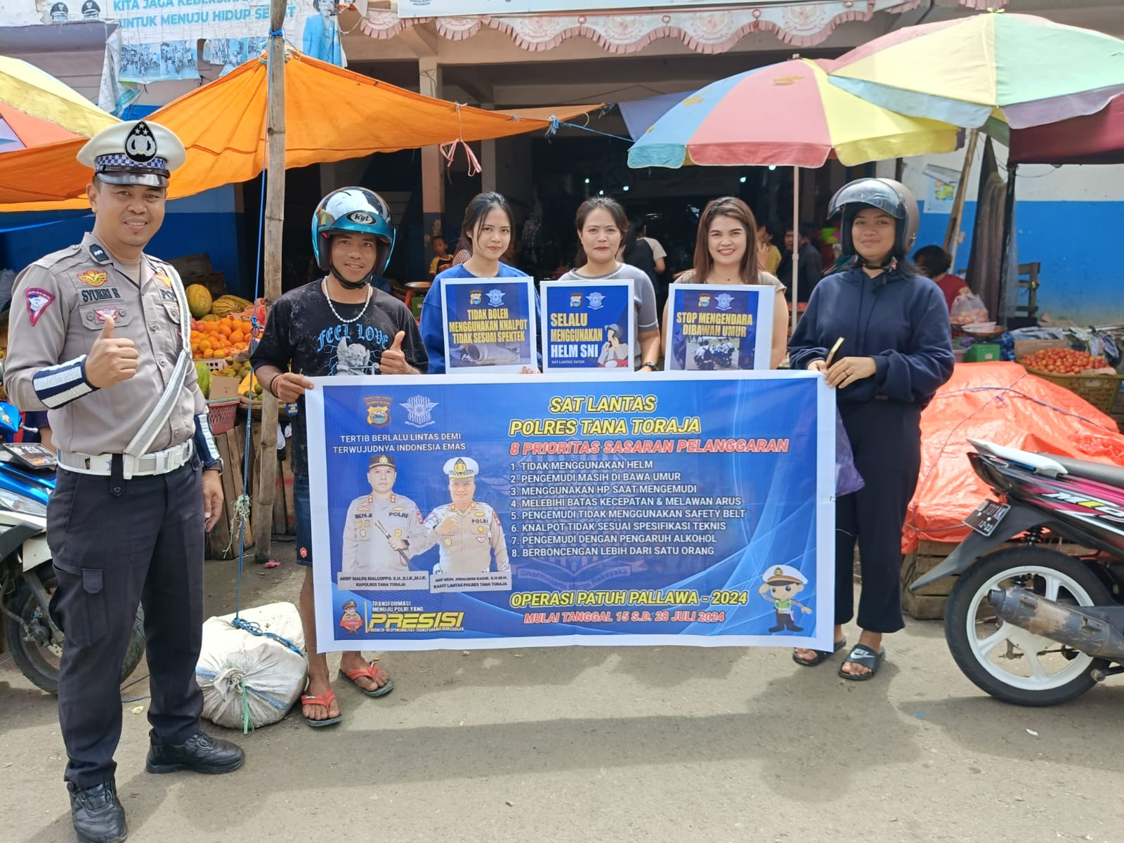 Terlihat personil satuan lalu lintas Polres Tana Toraja beri edukasi, sosialisasi dan himbauan di seputaran pasar sentral Makale Kabupaten Tana Toraja dengan sasaran para pengendara yang melintas.