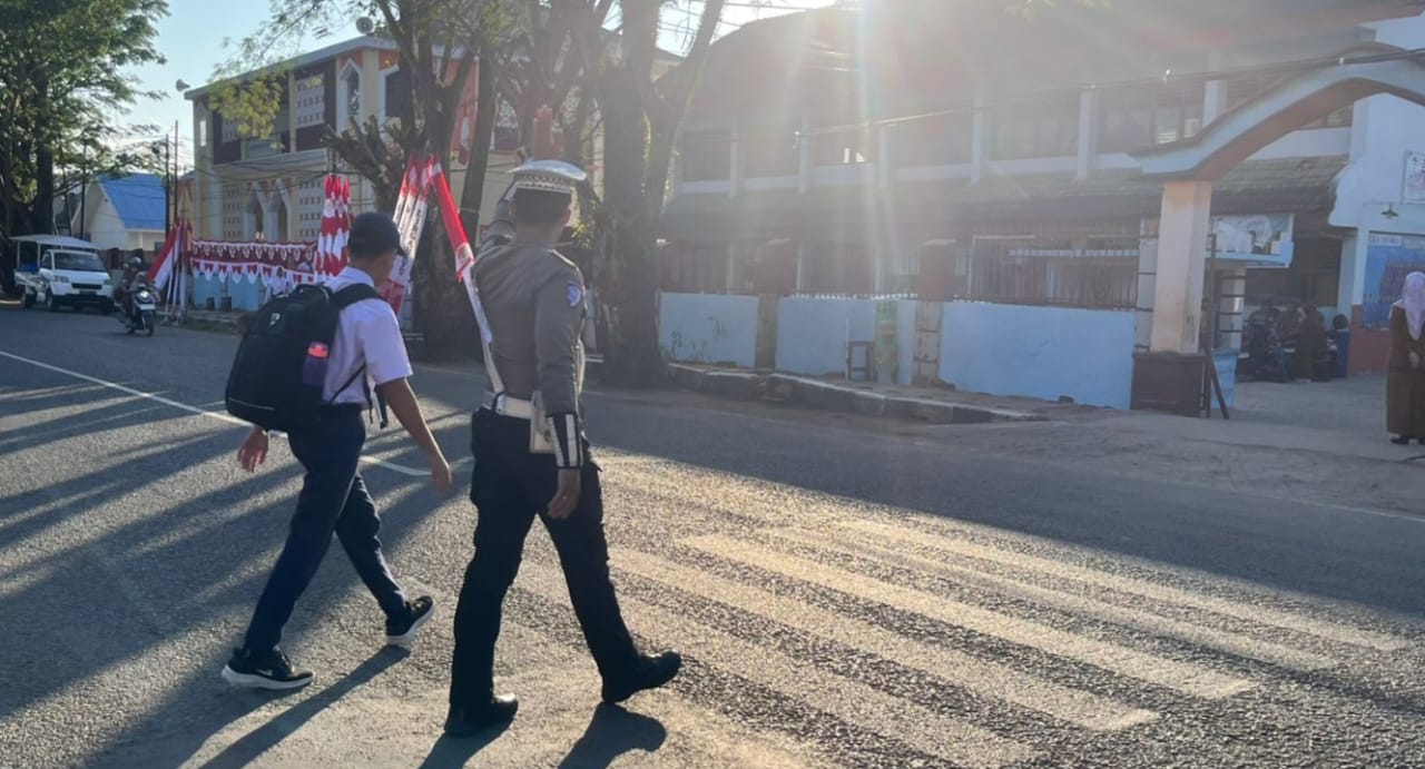 Tidak hanya mengatur kendaraan, personel Satlantas juga aktif membantu menyeberangkan pelajar dan pejalan kaki, serta mengingatkan pengendara untuk menggunakan helm dan mematuhi rambu lalu lintas.
