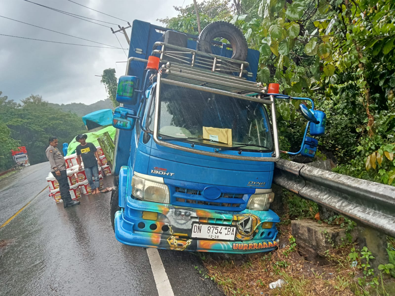 “As stir truk tersebut patah, menyebabkan truk oleng dan akhirnya menabrak pembatas jalan,” jelas Iptu Muh. Irwan.