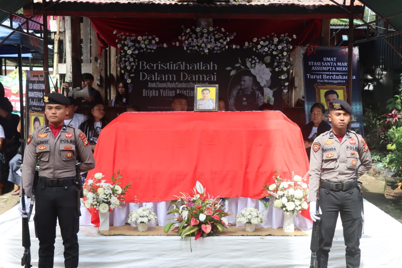“Saya atas nama Pimpinan dan Keluarga Besar Polres Toraja Utara mengucapkan turut berduka cita atas meninggalnya Almarhum Bripka Yulius Kristian Ramba, semoga diberikan ketabahan bagi keluarga yang ditinggalkan,” ucap Wakapolres.