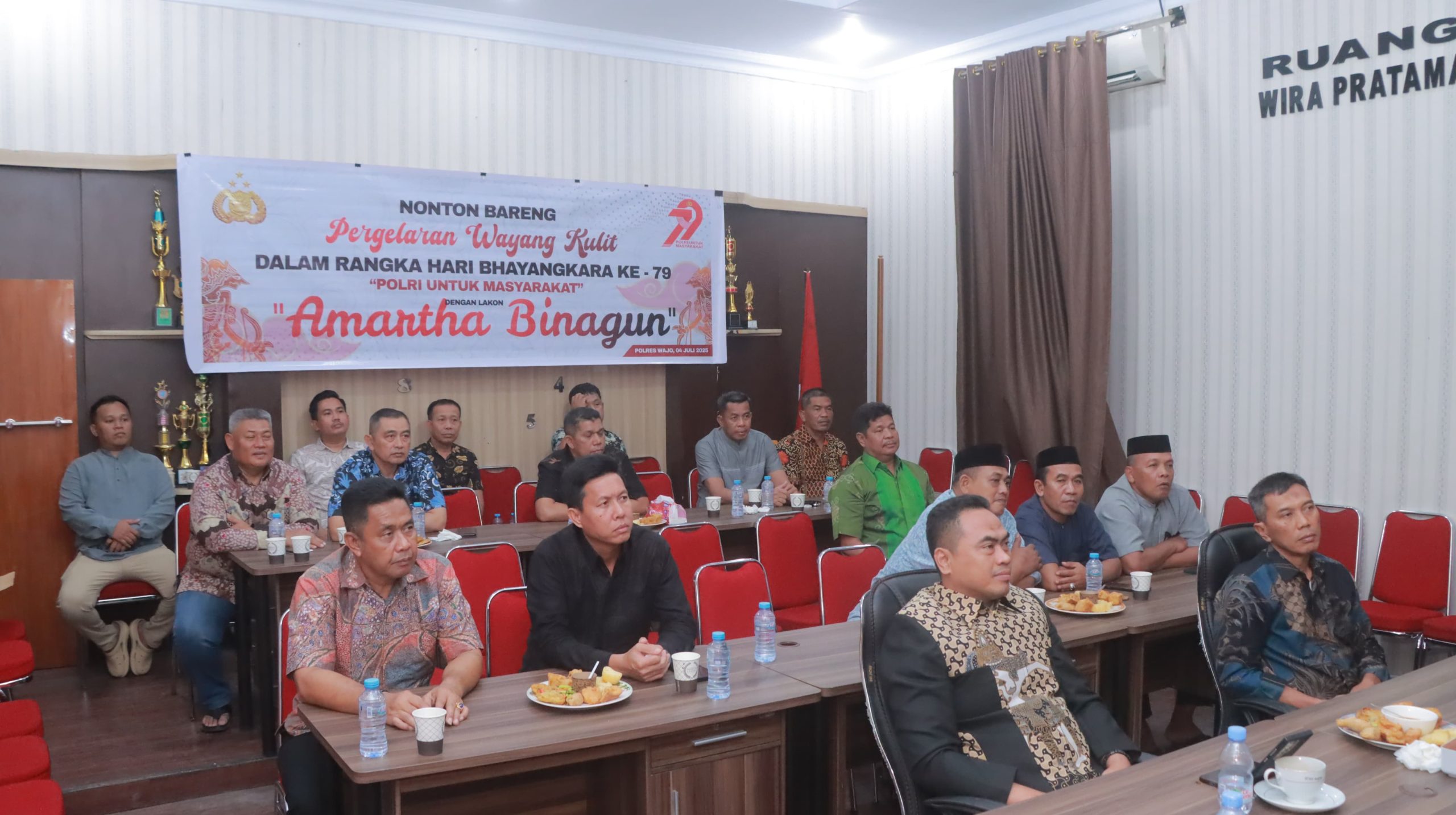 WAJO – Dalam rangka memperingati Hari Bhayangkara ke-79, Polres Wajo menggelar Nonton Bareng (NOBAR) pagelaran seni wayang kulit dengan lakon “Anartha Binangun” pada Kamis malam (4/7/2025), bertempat di Aula Wirapratama Mapolres Wajo.