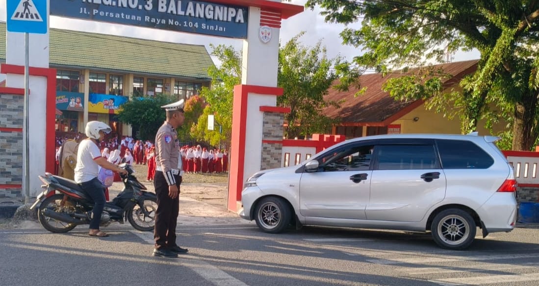Tidak hanya mengatur kendaraan, personel Satlantas juga aktif membantu menyeberangkan pelajar dan pejalan kaki, serta mengingatkan pengendara untuk menggunakan helm dan mematuhi rambu lalu lintas.